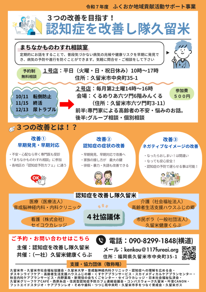 令和7年6月14日(土) くるめりあ六ツ門でものわすれ相談室を開催します